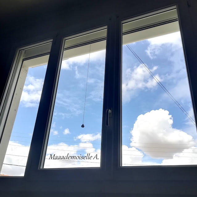 Il y a quelques temps, nous avons modifié l'agencement du salon. Nous avions la fenêtre dans le dos, et donc presque toujours des reflets dans l'écran de la télé, nous devions fermer les volets à chaque fois. On a donc décidé de tester un petit changement pour voir. Ma première réaction a été de me dire que mince, je ne voyais plus de vert depuis la fenêtre. Voir du vert depuis mes fenêtres, surtout dans les pièces de vie, a toujours été quelque chose d'extrêmement important pour nous, dans chacune de nos maisons. Je le vois toujours ailleurs, mais plus du canapé. Puis je me suis allongée, j'ai regardé par la fenêtre, et certes je n'ai pas de vert, mais j'ai le ciel et ses nuages. J'adore m'allonger là et les observer bouger ! C'est un délicieux moment de relaxation !