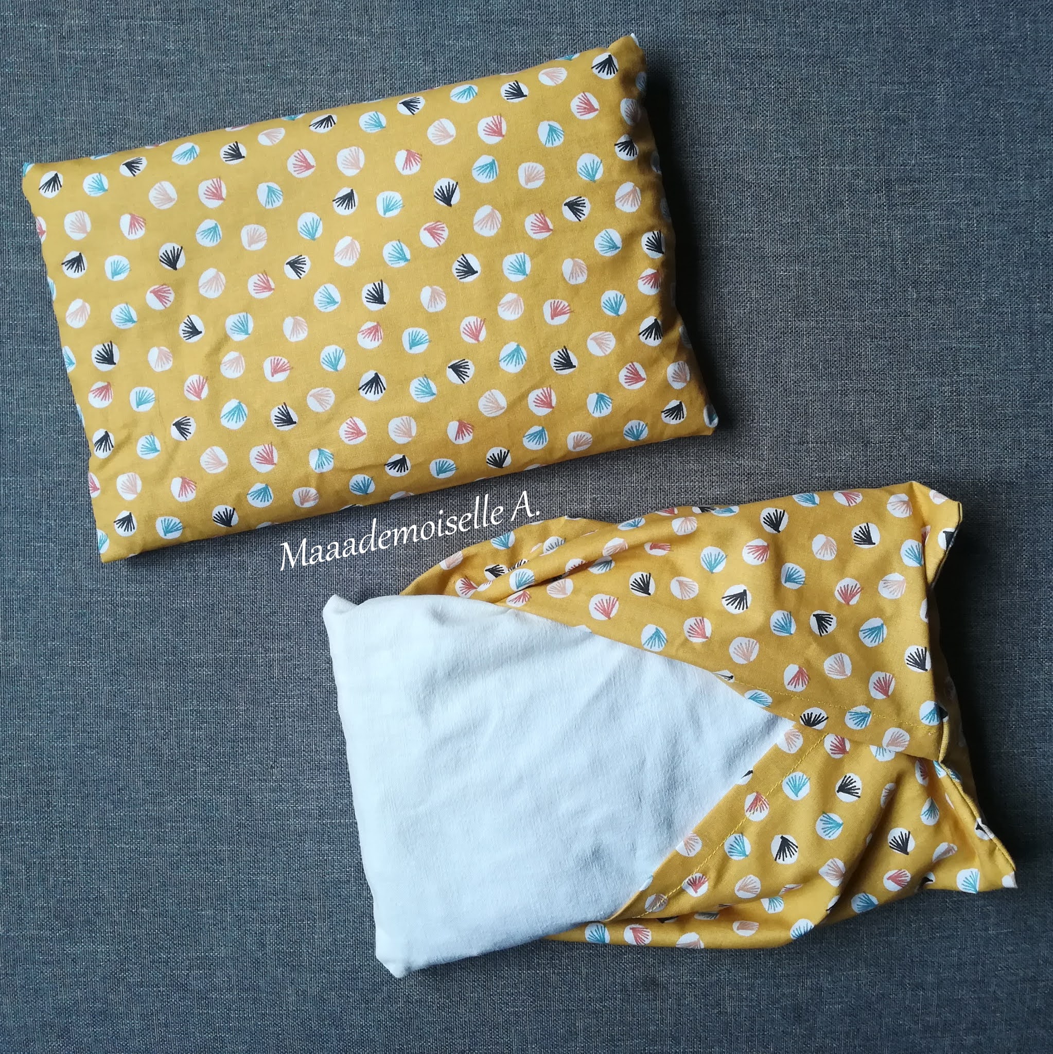 Aaaah, elles m'en ont donné du fil à retordre ces bouillottes sèches ! Non pas parce qu'elles étaient compliquées à coudre (c'est hyper simple comme projet, et rapide à faire !), mais parce qu'il fallait que j'arrive à avancer dessus sans être vue par les filles ! J'ai enfin pu réussir à mener à bien ces petits cadeaux qu'elles auront à Noël, et j'ai même pu prendre une petite photo ! 😊 J'ai donc fait quelque chose de simple, j'ai utilisé un tissu de récup donné par Elodie, et comme j'avais un petit coupon, j'ai donc commencé par la housse extérieure. J'ai choisi de faire une housse pour pouvoir remplacer les noyaux de la poche au besoin sans devoir tout refaire, pour éviter aussi que le tissu ne s'abime ou se salisse au fur et à mesure des utilisations et en théorie pour éviter d'avoir une poche trop chaude au contact du ventre, théorie parce que le tissu est quand même fin, donc pas sûre qu'il soit performant sur ce coup, on verra à l'usage 😉 En gros donc, la pochette restera jolie, pas grave si la poche intérieure s'abime 😉 J'ai fait une simple housse type coussin, sans pression ni rien du tout, juste un grand rabat qui passe au dessus de l'autre, afin que ce soit bien propre une fois refermé et que les filles puissent être autonomes dans l'utilisation simplifiée. Suite à cela (et après 72 calculs ratés 😄), j'ai fait la poche intérieure, celle qui contient les noyaux et celle qui sera chauffée. Elle contient des noyaux mis à sécher, puis nettoyés et remis à sécher, nous avons des cerises, des dattes, des abricots, des prunes, bref un peu de tout 😊 Le format est volontairement petit, afin d'être adaptés aux petits bidons des filles, et j'ai déjà prévu de les mettre dans ma valise de maternité pour m'aider à endurer la douleur des tranchées utérines, j'ai énormément souffert pour ma deuxième et il parait que c'est de pire en pire 😬 Voilà, je crois en avoir fait le tour, si jamais vous avez des questions à leur sujet, n'hésitez pas ! 😊